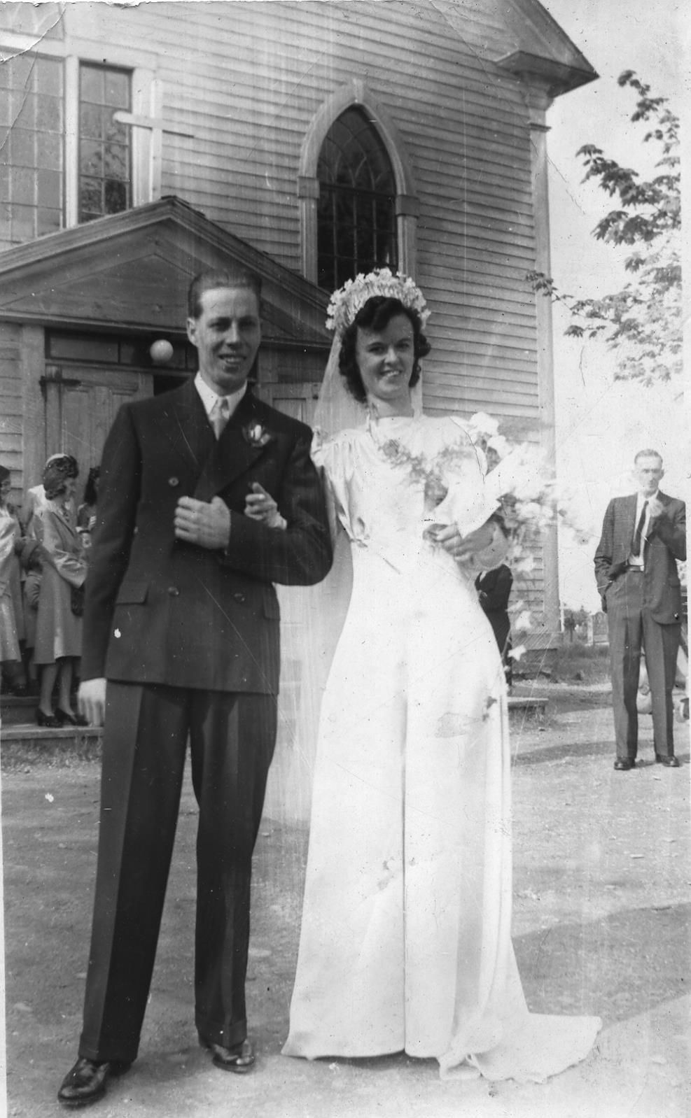 Les parents de Nadine Belliveau, Ina et Adophe Belliveau, à leur mariage, devant l'église originelle / Parents of Nadine Belliveau, Ina et Adophe Belliveau, at their marriage, in front of the original Church