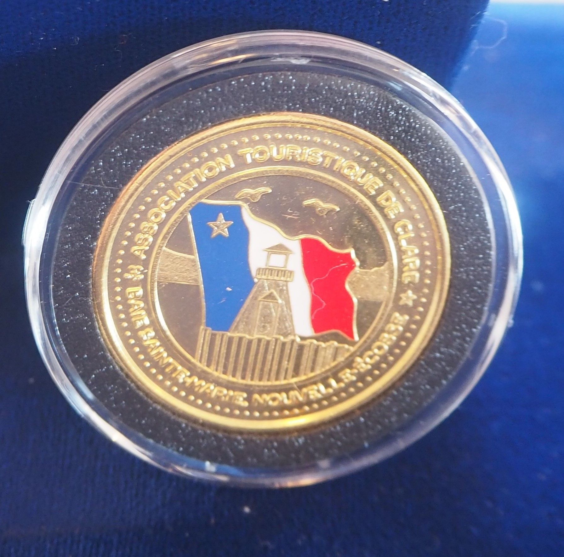 Monnaie plaqués or - avec le drapeau acadien au revers émaillé dans une capsule en plastique, expédition incluse.